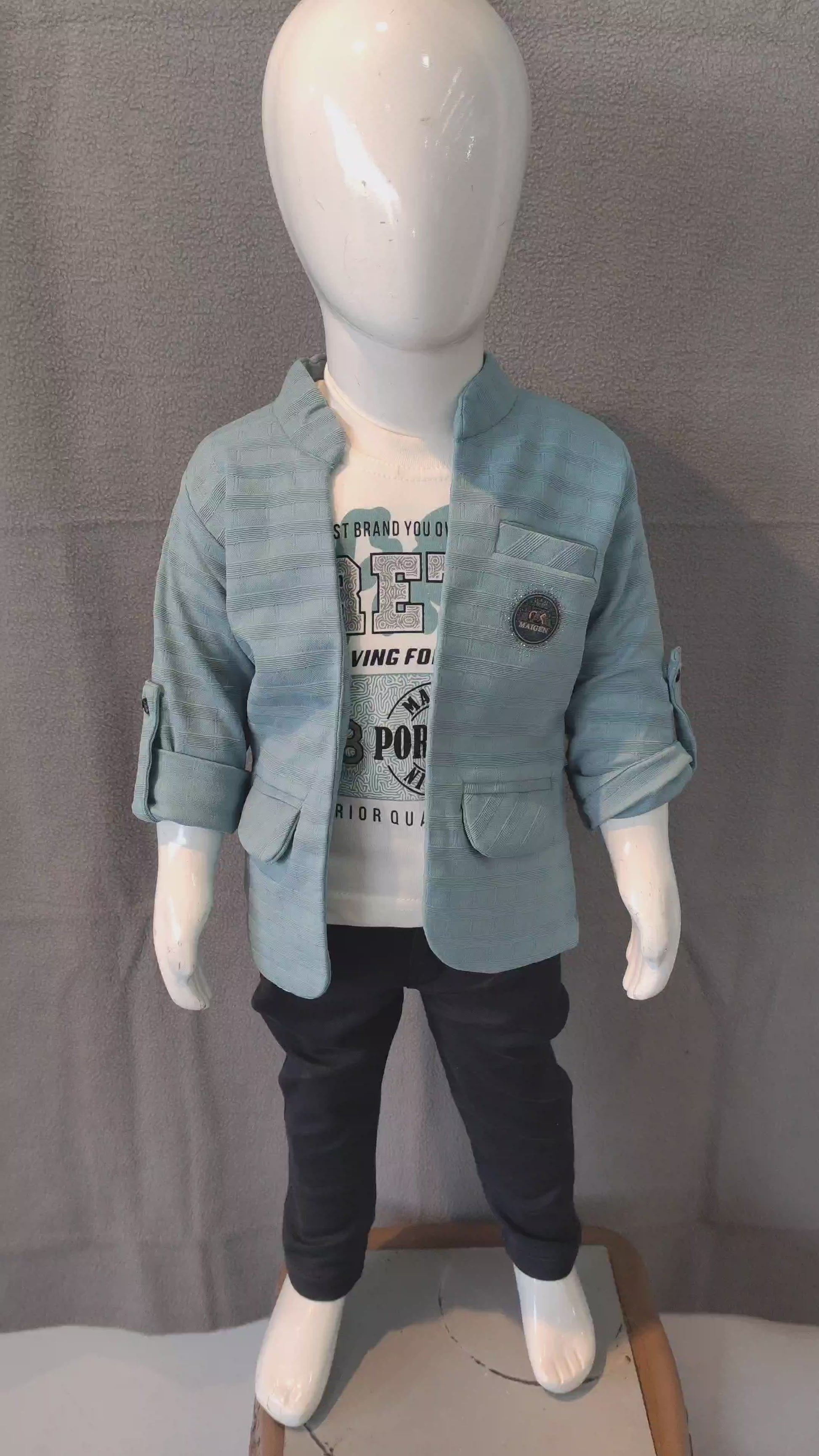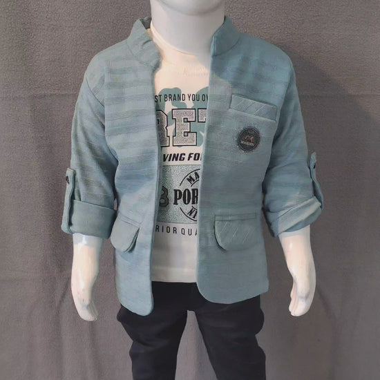 This charming boys’ outfit blends comfort with a smart, fashionable edge. The set includes a sky-blue striped blazer with a sleek mandarin collar, roll-up sleeves, and a stylish badge detail for a classy touch. Inside, a white printed T-shirt adds a fun, casual vibe, perfectly paired with navy-blue trousers for a neat and modern look.