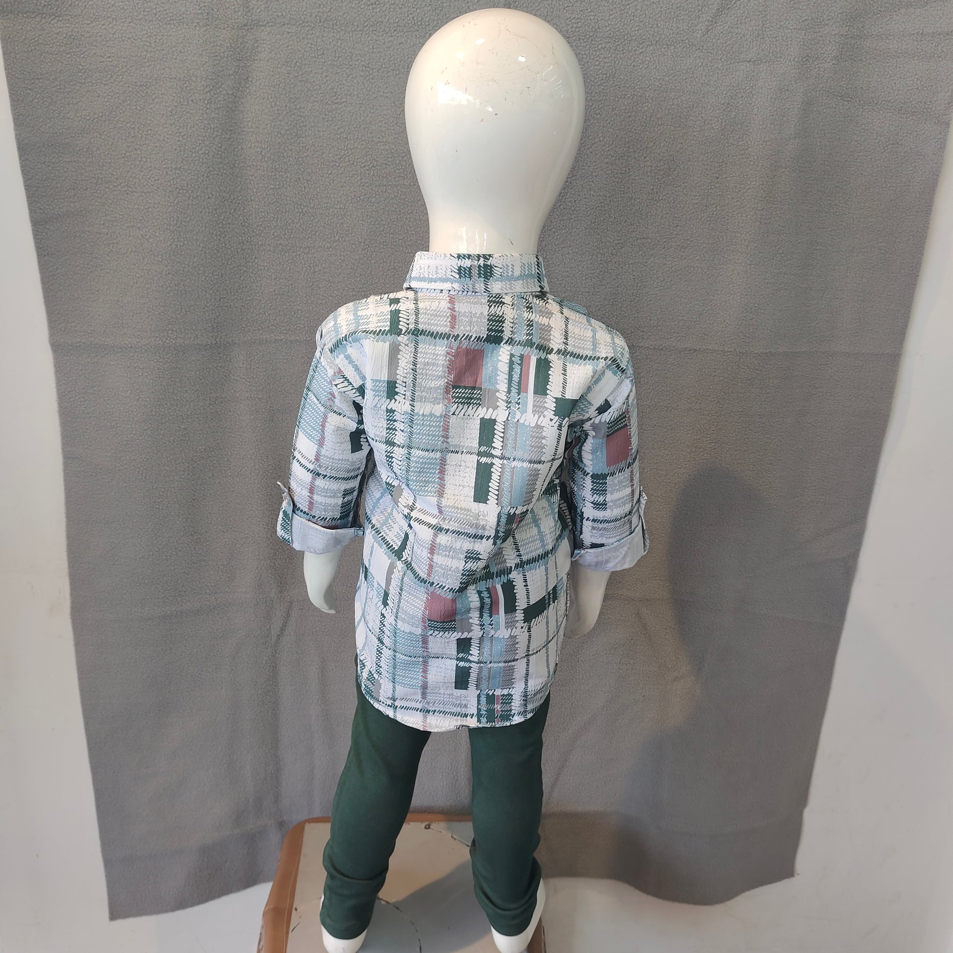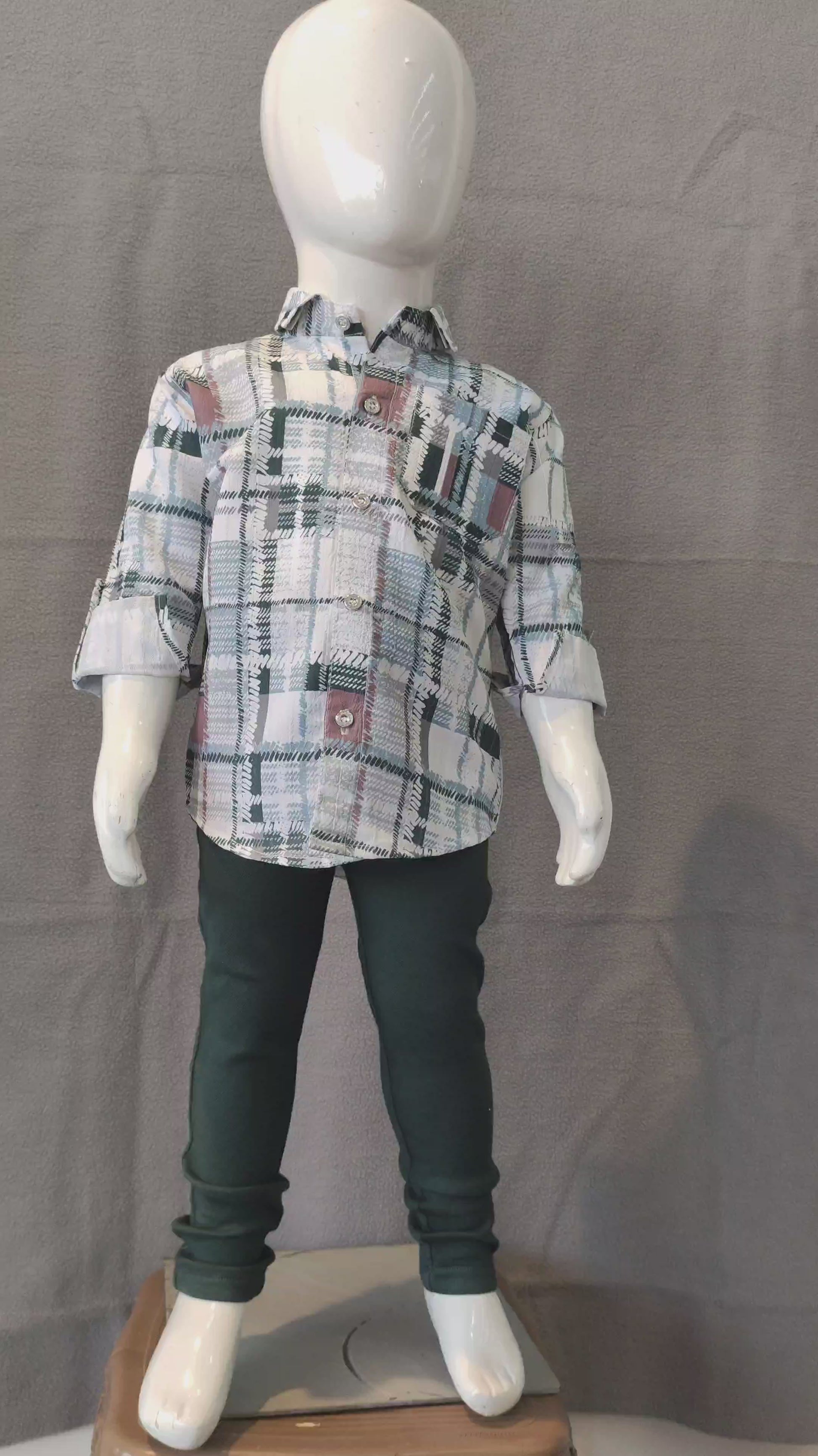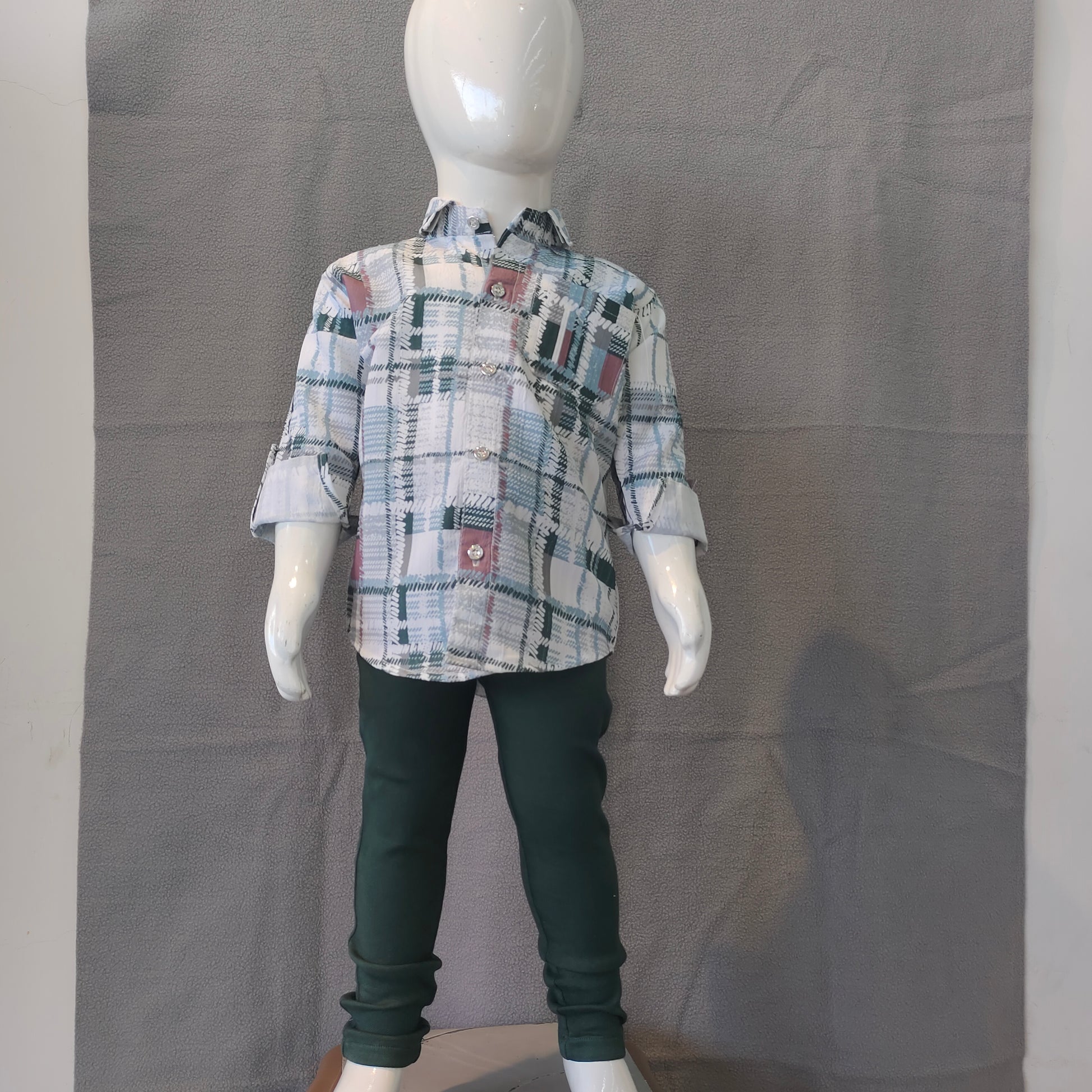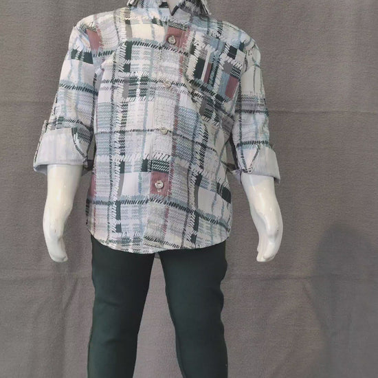 This stylish boys’ checkered shirt set offers a perfect blend of comfort and everyday fashion. The green and white plaid shirt features subtle hints of maroon, roll-up sleeves with button tabs, and a front pocket for a neat, modern touch. Paired with dark green slim-fit pants, this outfit is ideal for both casual outings and semi-formal occasions.