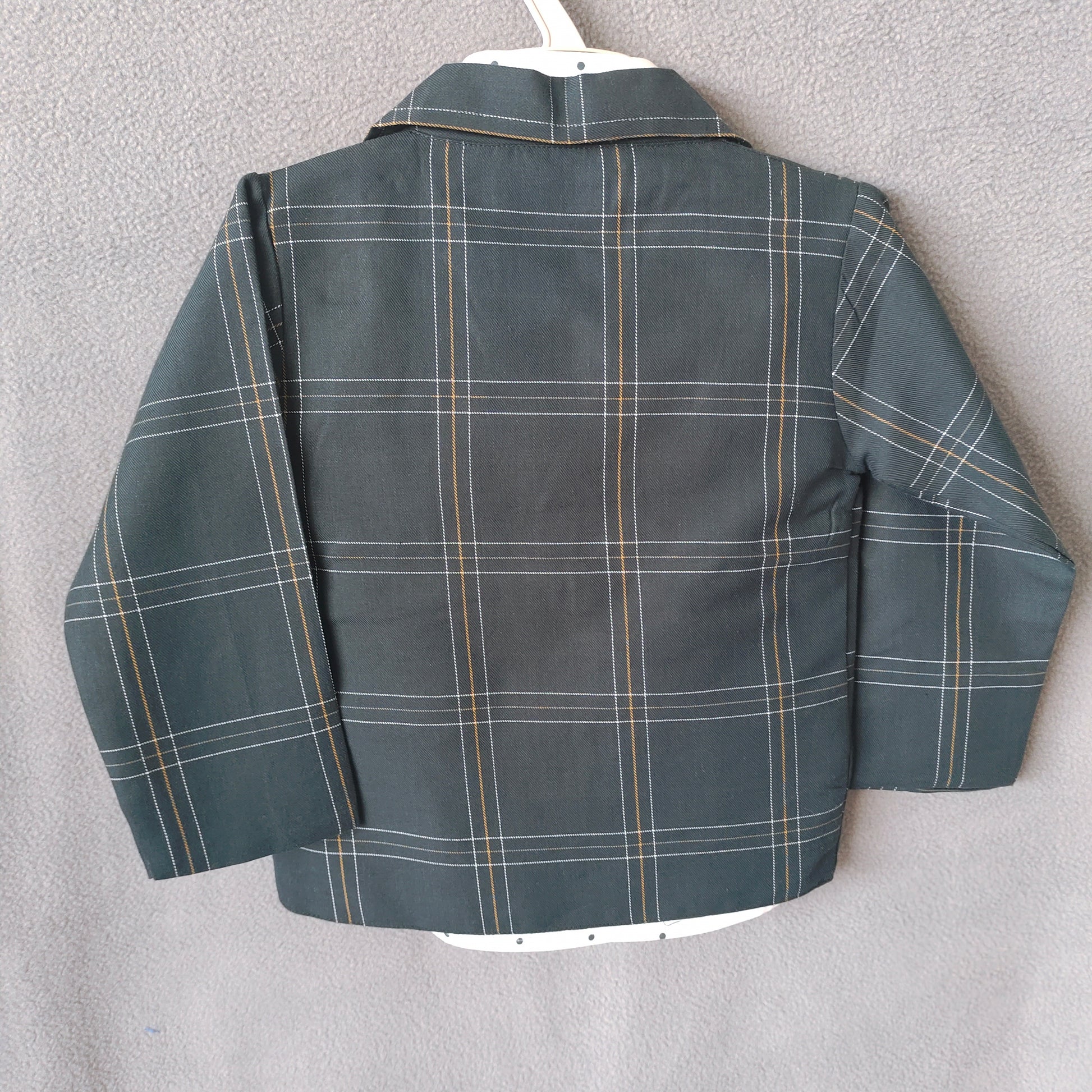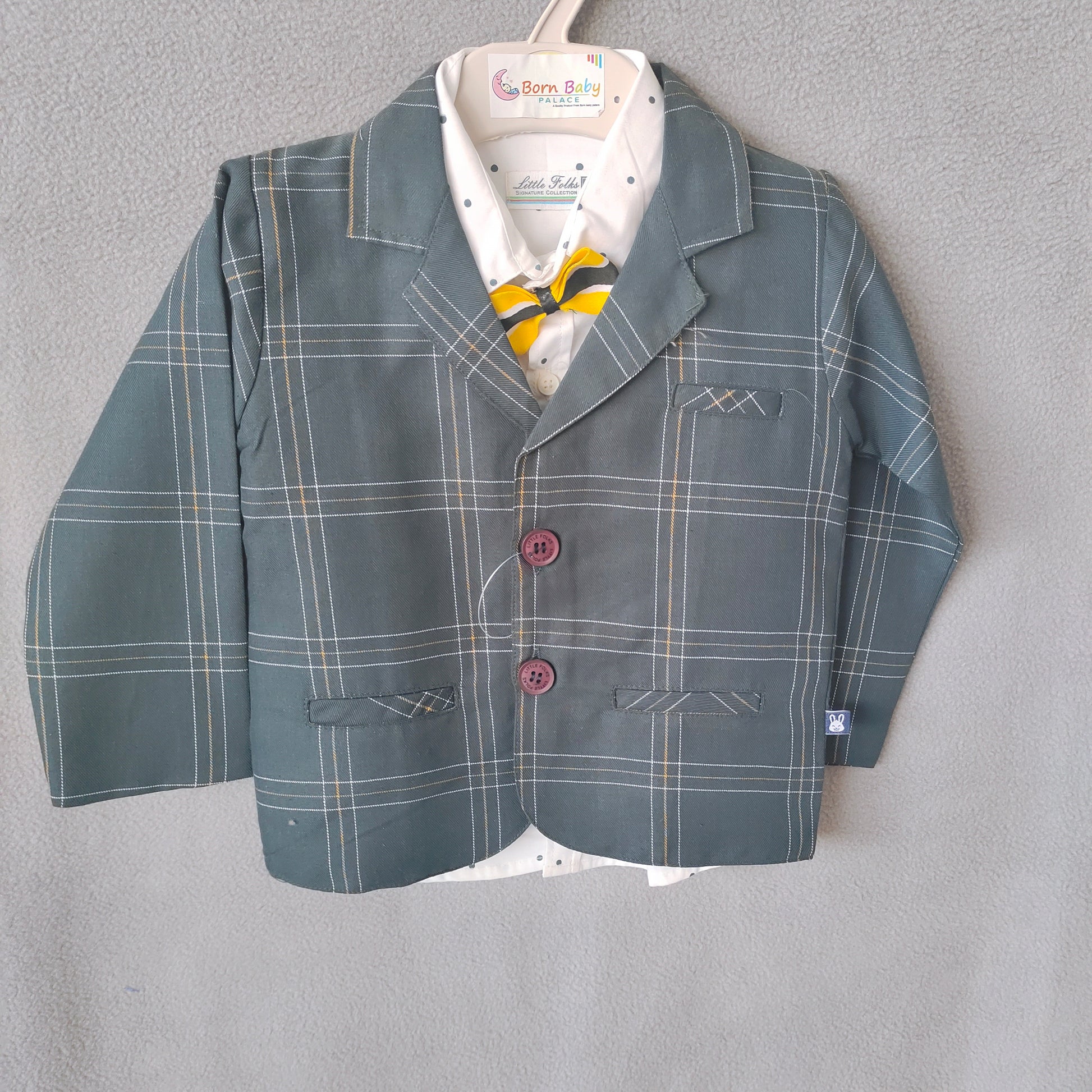 This elegant boys’ suit set features a smart black blazer with a subtle white checkered pattern, paired with matching trousers for a polished formal look. The blazer includes classic notch lapels, flap pockets, and contrasting maroon buttons for added style. Inside, a white printed shirt with tiny polka dots and a trendy yellow–black bow tie completes the outfit with a charming touch.