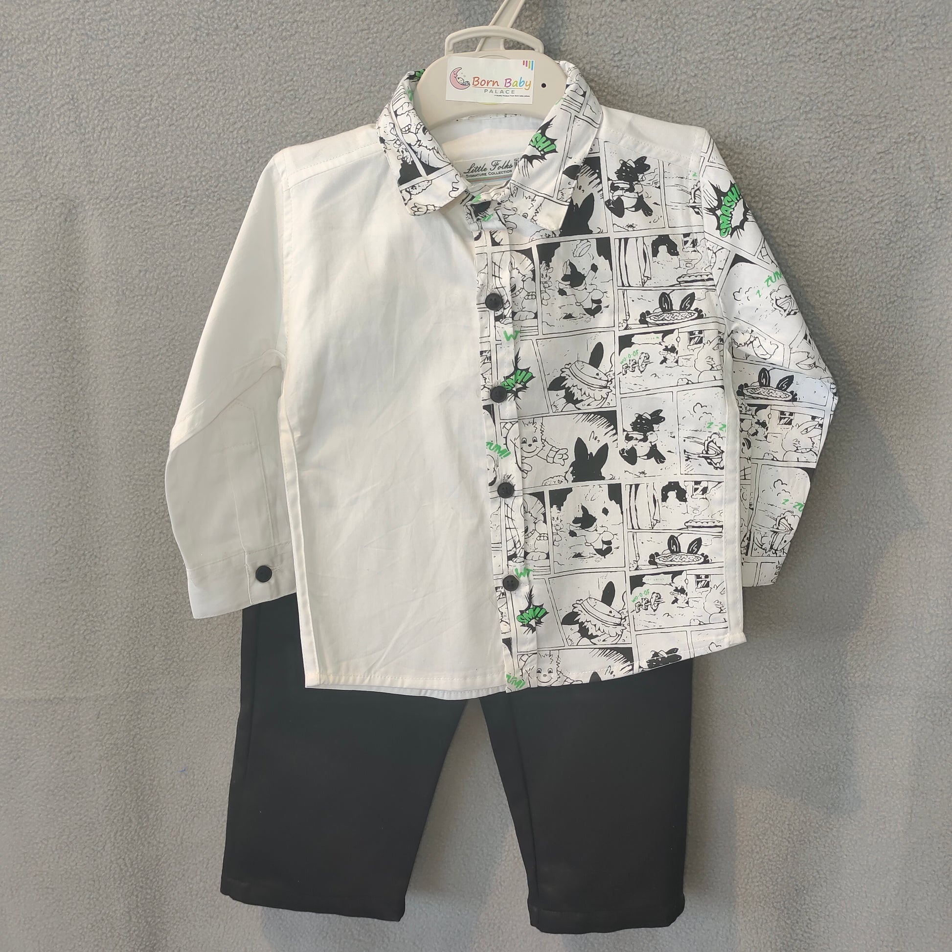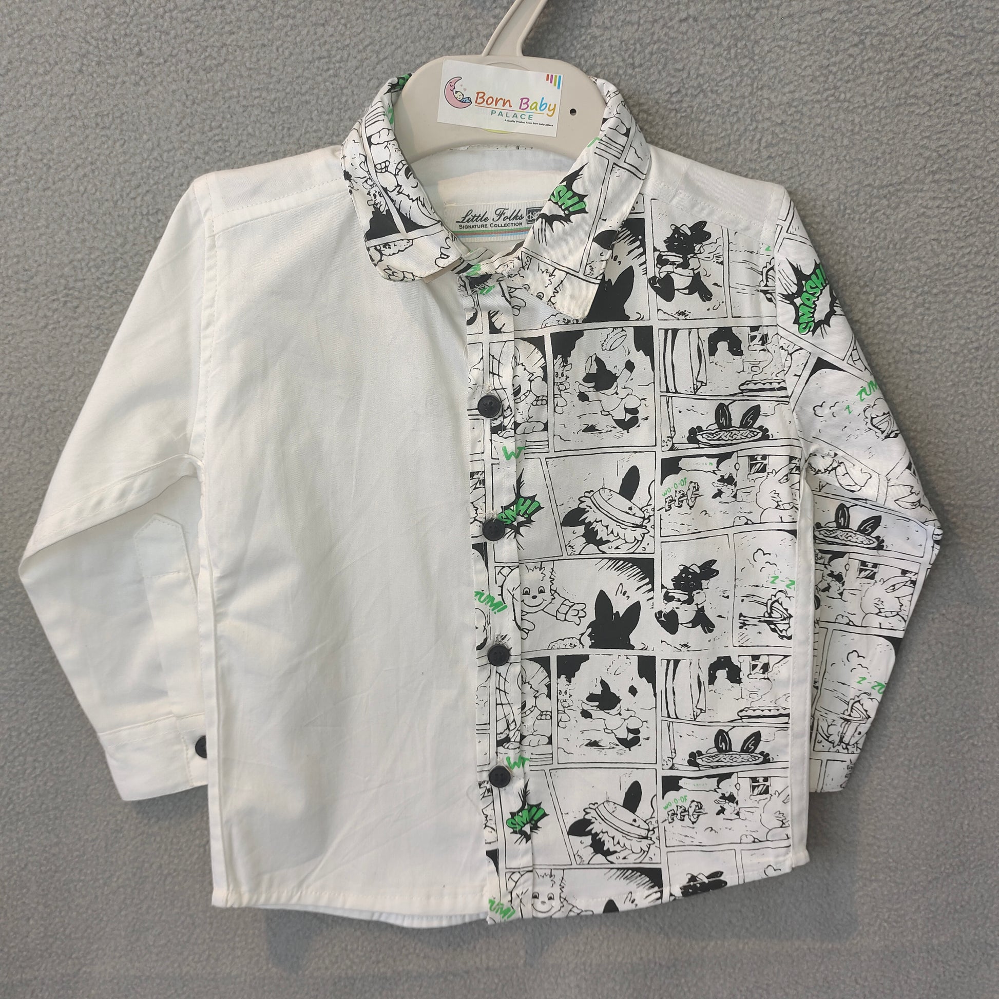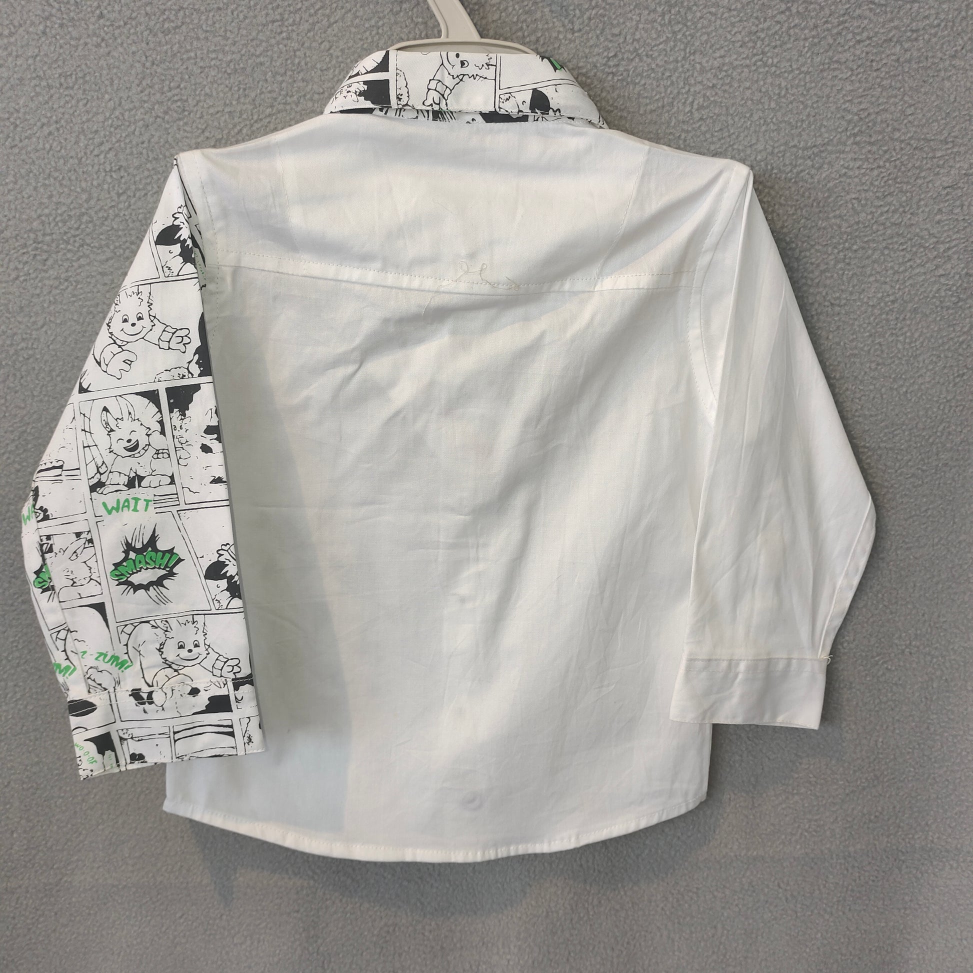 This unique boys’ shirt features a cool half-and-half design with one side in solid white and the other side in a fun black-and-white comic-style print accented with pops of green. The printed collar and matching button line add extra style for a fashionable, modern look. Made from soft, breathable fabric, it ensures comfort along with standout style.