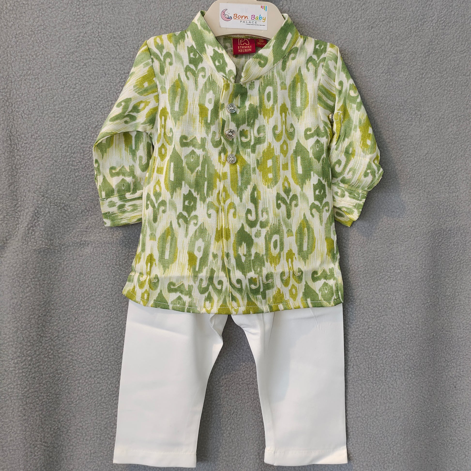 Dress your little one in style with this elegant green Ikat print kurta set from Born Baby Palace. Featuring a soothing blend of green and white hues in a traditional Ikat pattern, this kurta is designed with a mandarin collar and stylish buttons for a refined ethnic look. The soft white trousers offer a clean contrast, ensuring comfort and charm throughout the day. Perfect for festive occasions, family gatherings, and cultural celebrations — this outfit brings together tradition, comfort, and modern flair for your young one.