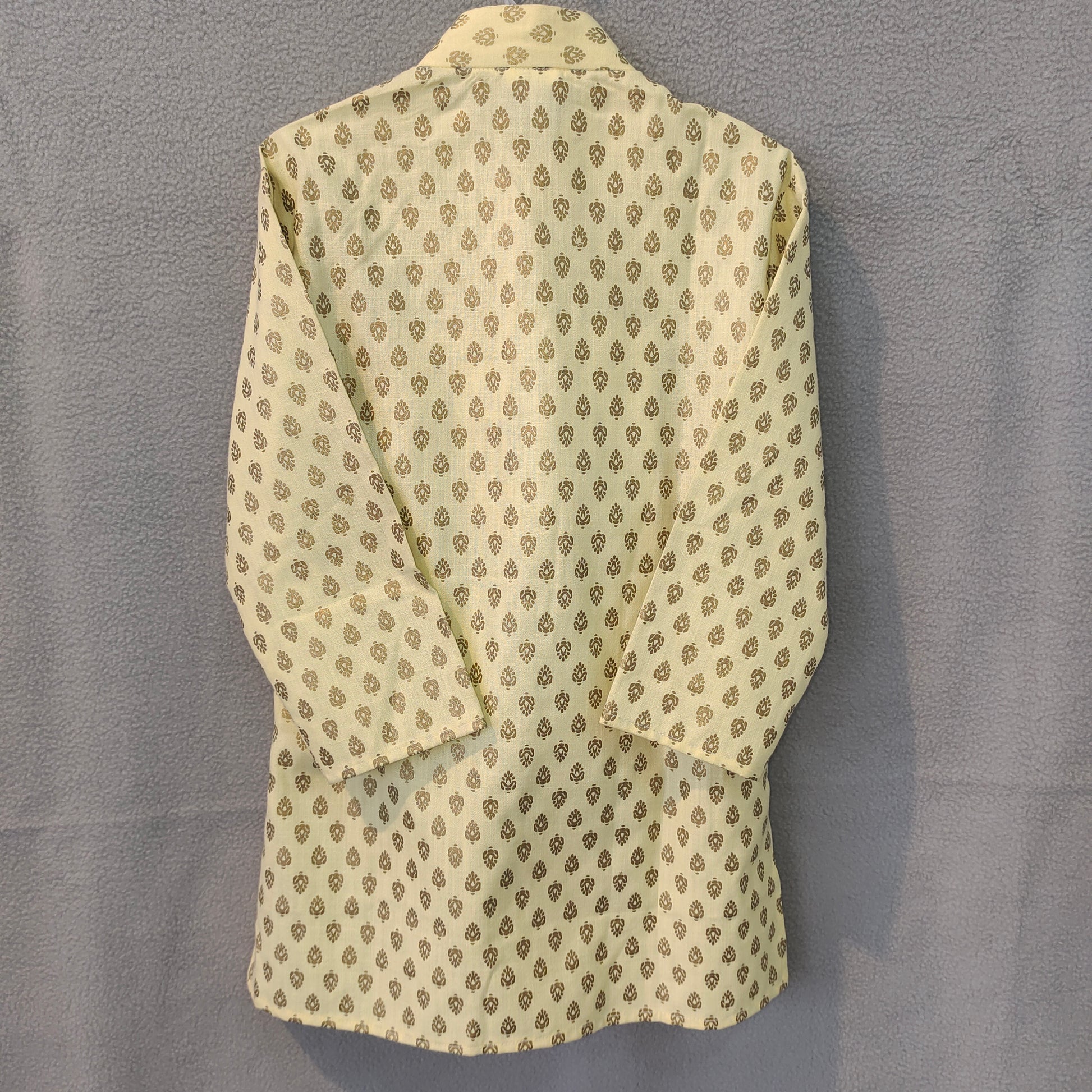 Brighten up festive occasions with this elegant golden yellow kurta for boys. Designed with a rich traditional print and wooden button placket, it radiates a royal charm perfect for celebrations and family gatherings. The mandarin collar and soft cotton-blend fabric ensure both comfort and style. Pair it with white pyjamas or churidar pants for a complete ethnic look.