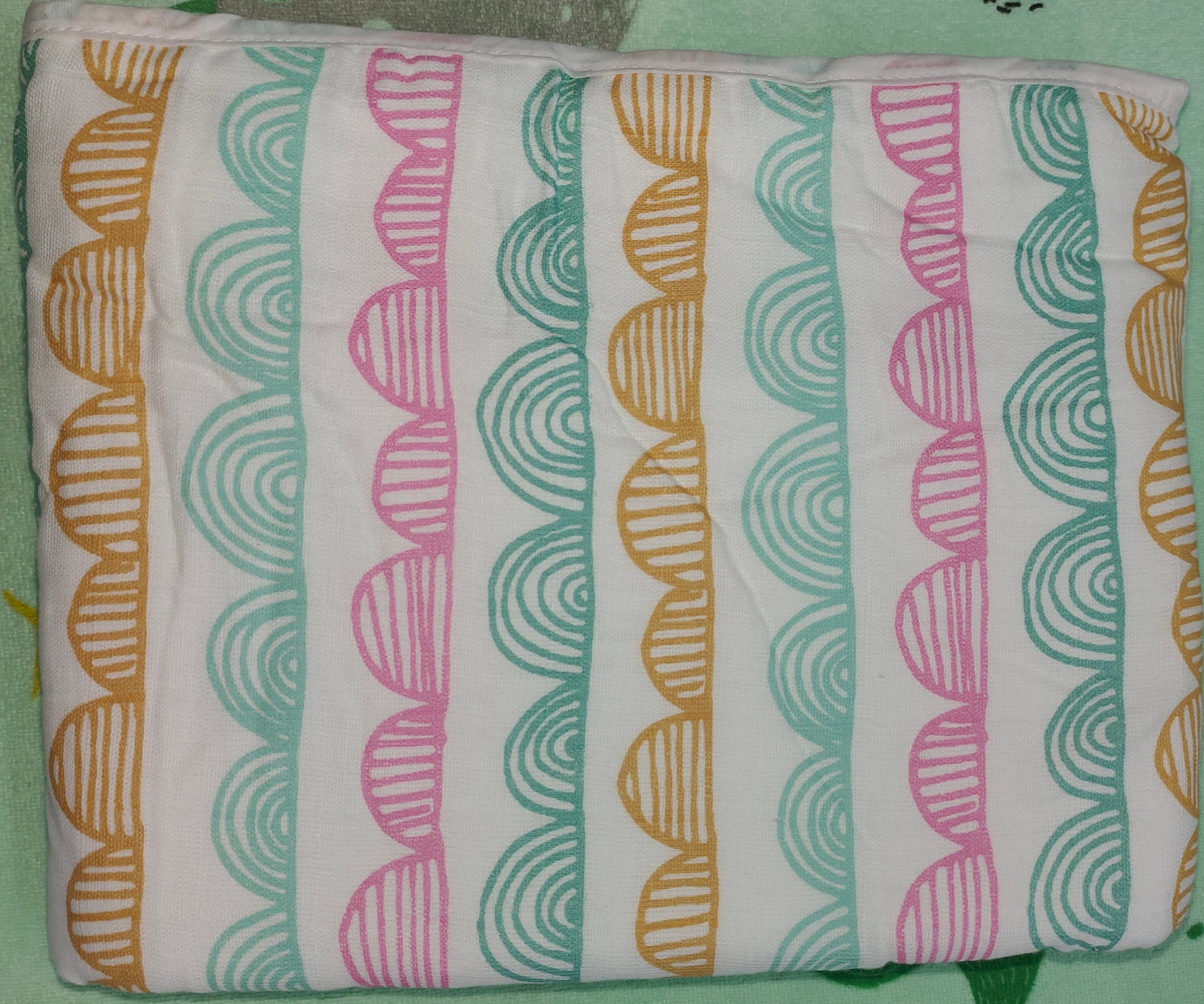 This fabric features a soft white base decorated with colorful wavy stripe patterns in mint green, mustard yellow, and pastel pink. Each stripe has a playful, semi-circular design filled with fine line detailing, giving it a modern yet cheerful look.